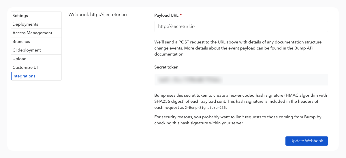 After adding your webhook, a confirmation will be displayed. From this screen, you can modify the payload URL and find the secret token to be used (which helps securing requests coming from Bump).