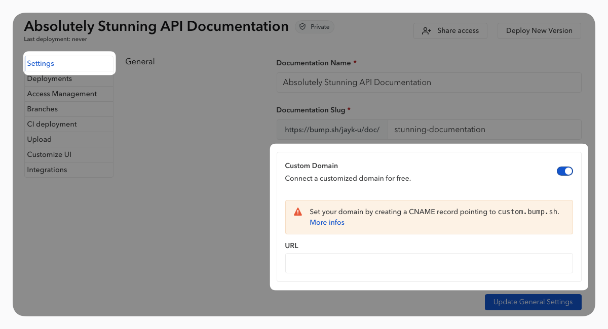 From the settings of your documentation, check the “Custom domain” box. You will then be asked to enter the URL of your custom domain, which has been configured on your end in the previous step. Confirm by selecting “Update General Settings”. SSL certificates are automatically issued at this step.