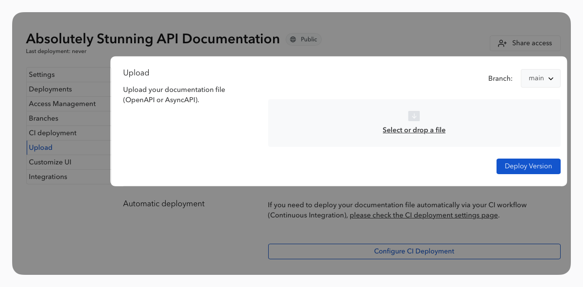 Publishing your first API documentation on Bump.sh will only take you a few moments. Creating an account, documentation, and uploading your first API definition can be done in just a few clicks.