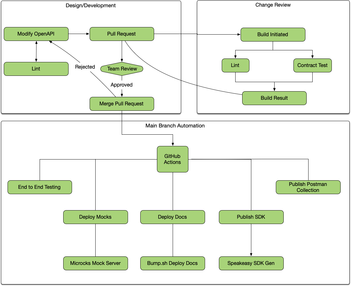 Once the changes are merged to the main branch, it means documentation, mock servers, SDKs, and anything else can all be updated along with the main deployment of the source code, so there is no divergence between the code and all these other artifacts.